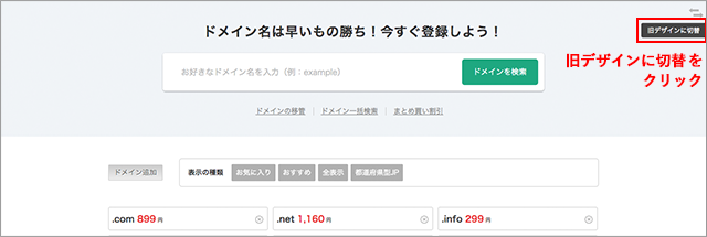 1)ドメイン検索ページにある、矢印のマークから「旧デザインに切替」ボタンを押します。